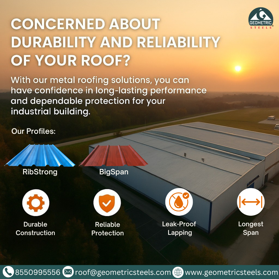 metal roofing sheets manufacturer, industrial roofing sheets, profile sheets, RibStrong roofing, BigSpan roofing, metal roofing India, roofing sheets supplier, industrial roofing solutions, durable metal roofing, leak-proof roofing sheets, roofing sheets for factories, roofing sheets online India, metal roof panels manufacturer, roofing sheets for warehouses, Geometric Steels roofing,